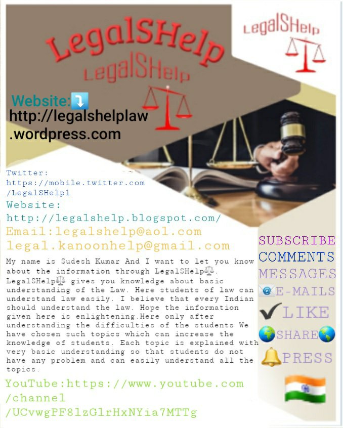 ABOUT :My name is Sudesh Kumar And I want to let you know about the information through LegalSHelp⚖. LegalSHelp⚖ gives you knowledge about basic understanding of the Law. Here students of law can understand law easily. I believe that every Indian should understand the law. Hope the information given here is enlightening.Here only after understanding the difficulties of the students We have chosen such topics which can increase the knowledge of students. Each topic is explained with very basic understanding so that students do not have any problem and can easily understand all the topics.